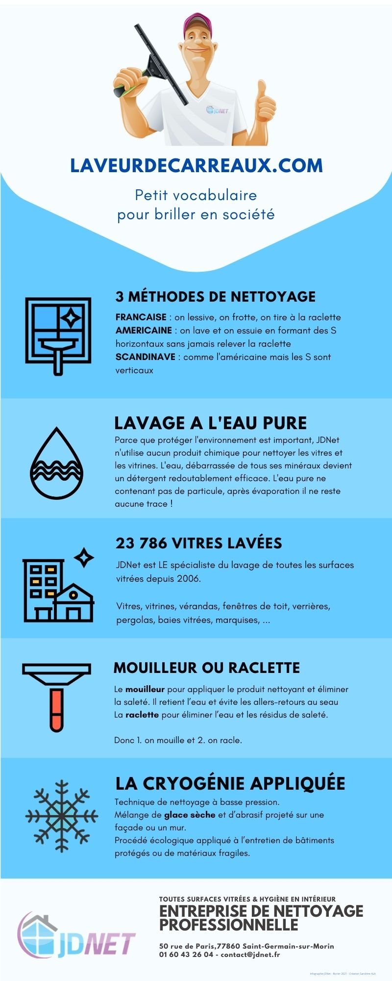 Quelle différence entre un mouilleur et une raclette, un lavage à l’eau pure ça veut dire quoi, la cryogénie appliquée au bâtiment et les méthodes de nettoyage des vitres. JDNet vous offre quelques mots de vocabulaire sur son métier. A vous d’essayer de les replacer lors d’une conversation avec vos amis. Pour la raclette c’est tout à fait de saison !